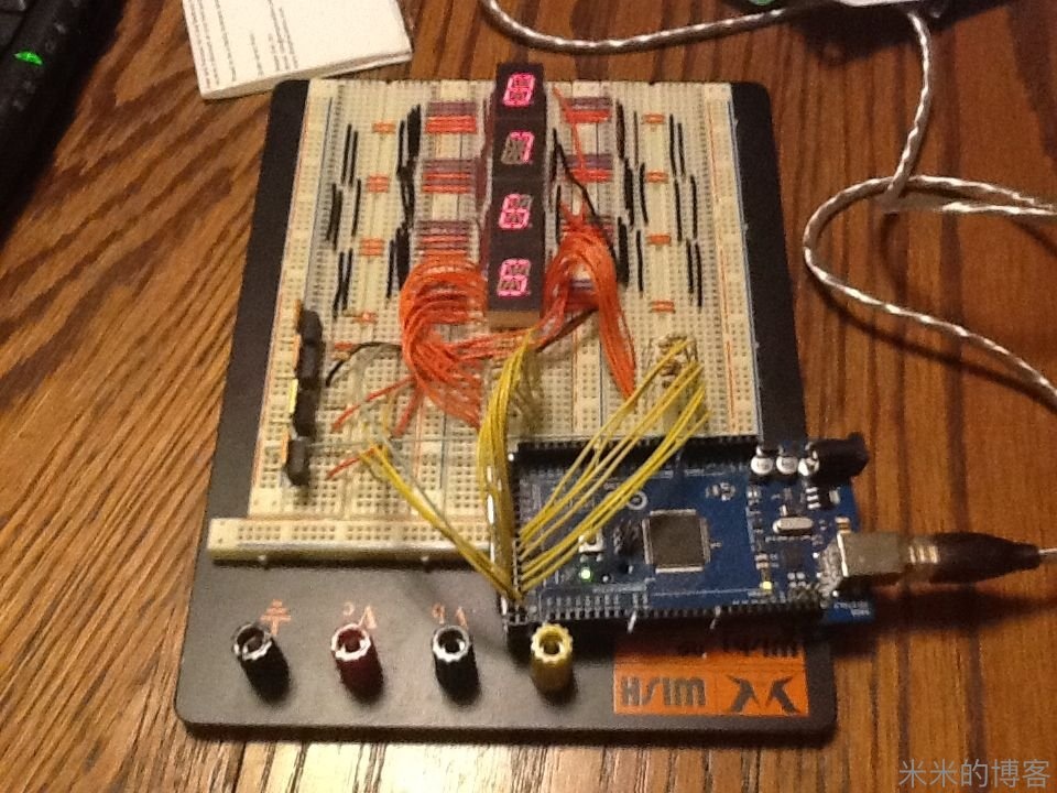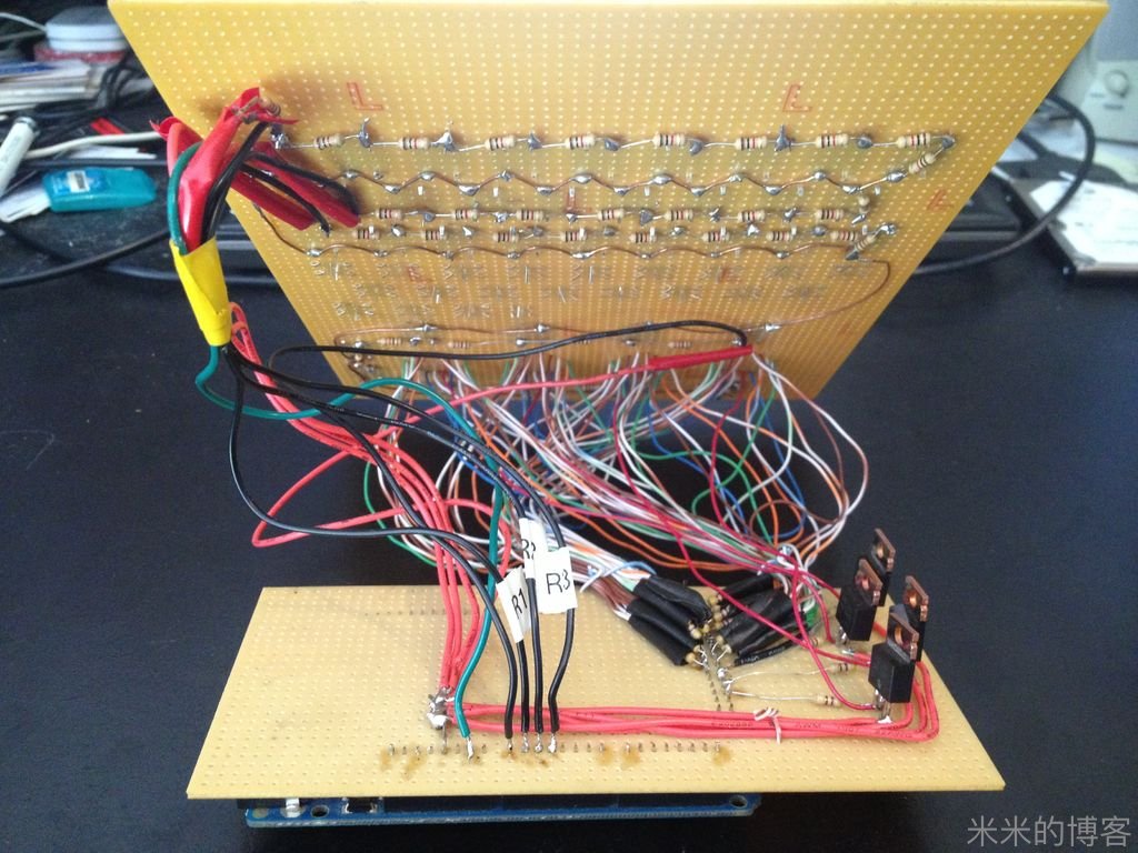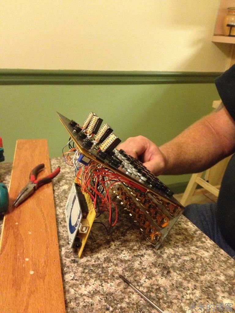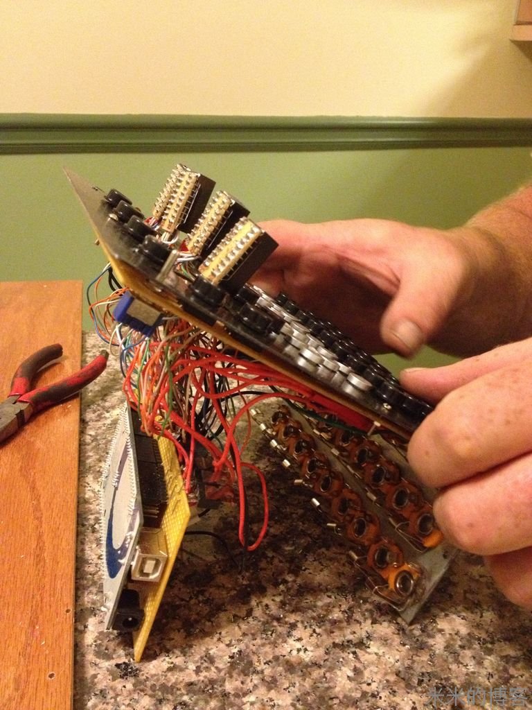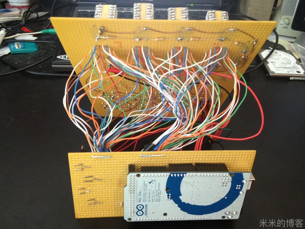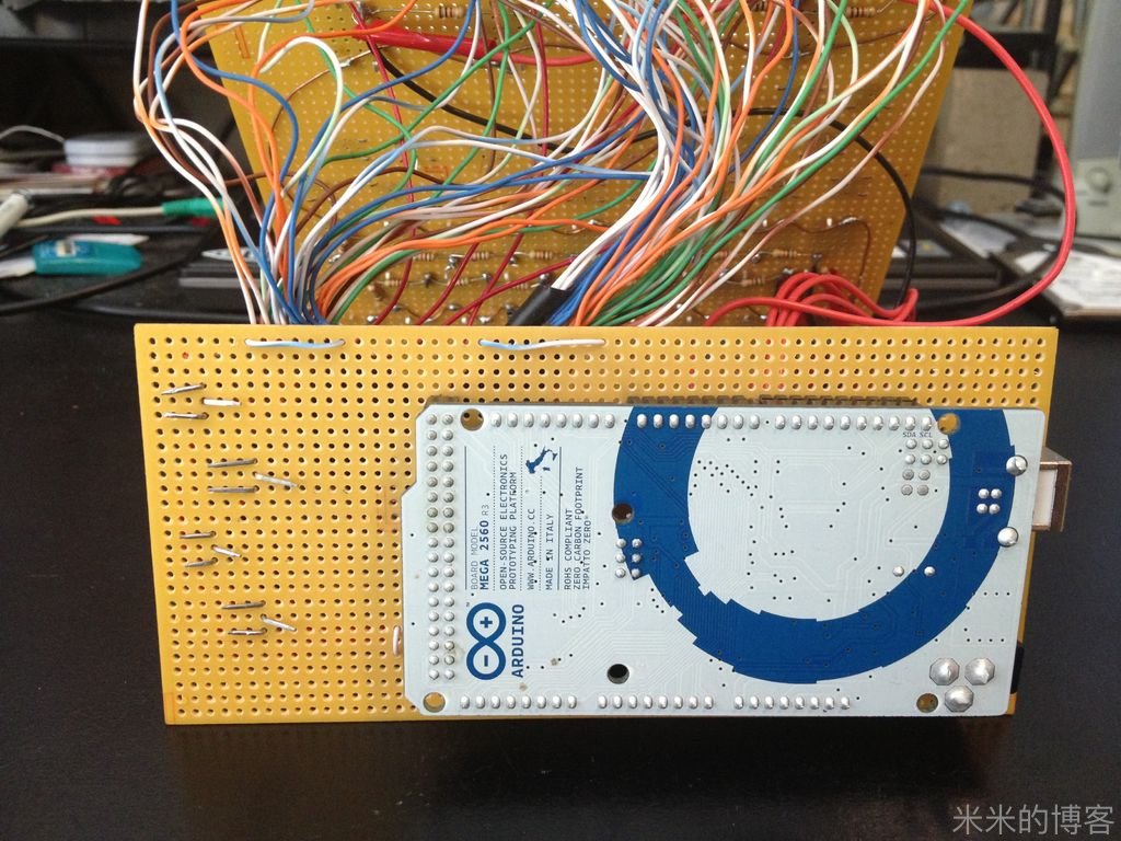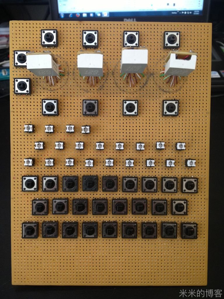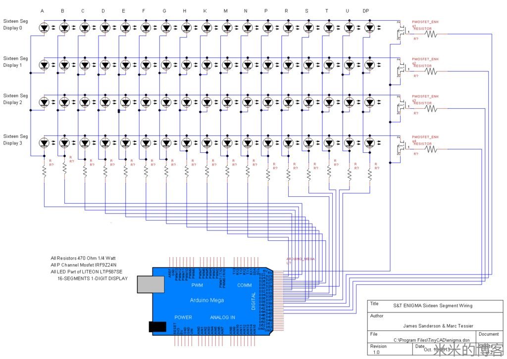 采用多路复用 LED 电路,仅用 38 个针脚的 115 个发光二极管和 4 个针脚的 36 个按键所连接的整个电路,全靠在键盘回路里准确放置的电阻以及 P 沟道场效应晶体管得以实现。要不然,4 个 16 段显示器,以及每个按键上的 LED 将大幅增加所需针脚总量 —— 即使用了 Arduino Mega 板,但如果没用上述两个方法,电路也不能如此简洁。