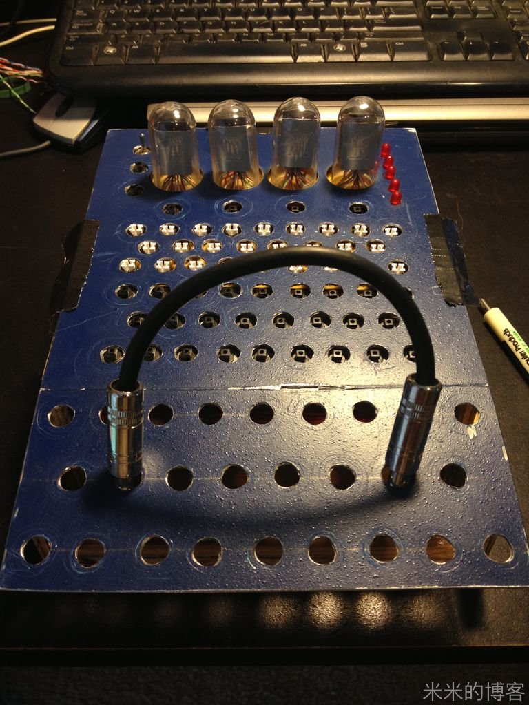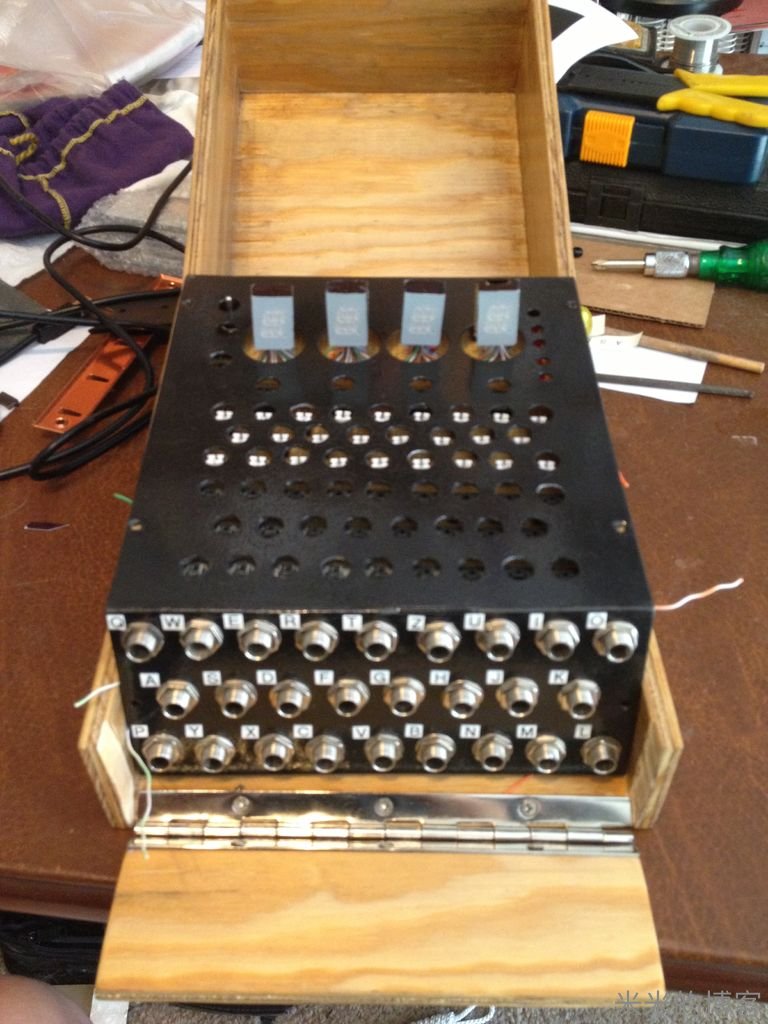 我们真要做的时候,是不会用 1 / 4 英寸接口的。它们太大的体积几乎要超过整个恩尼格玛机。香蕉插头体积较小,而且比原版德国 Enigma 机结合得更紧密些。