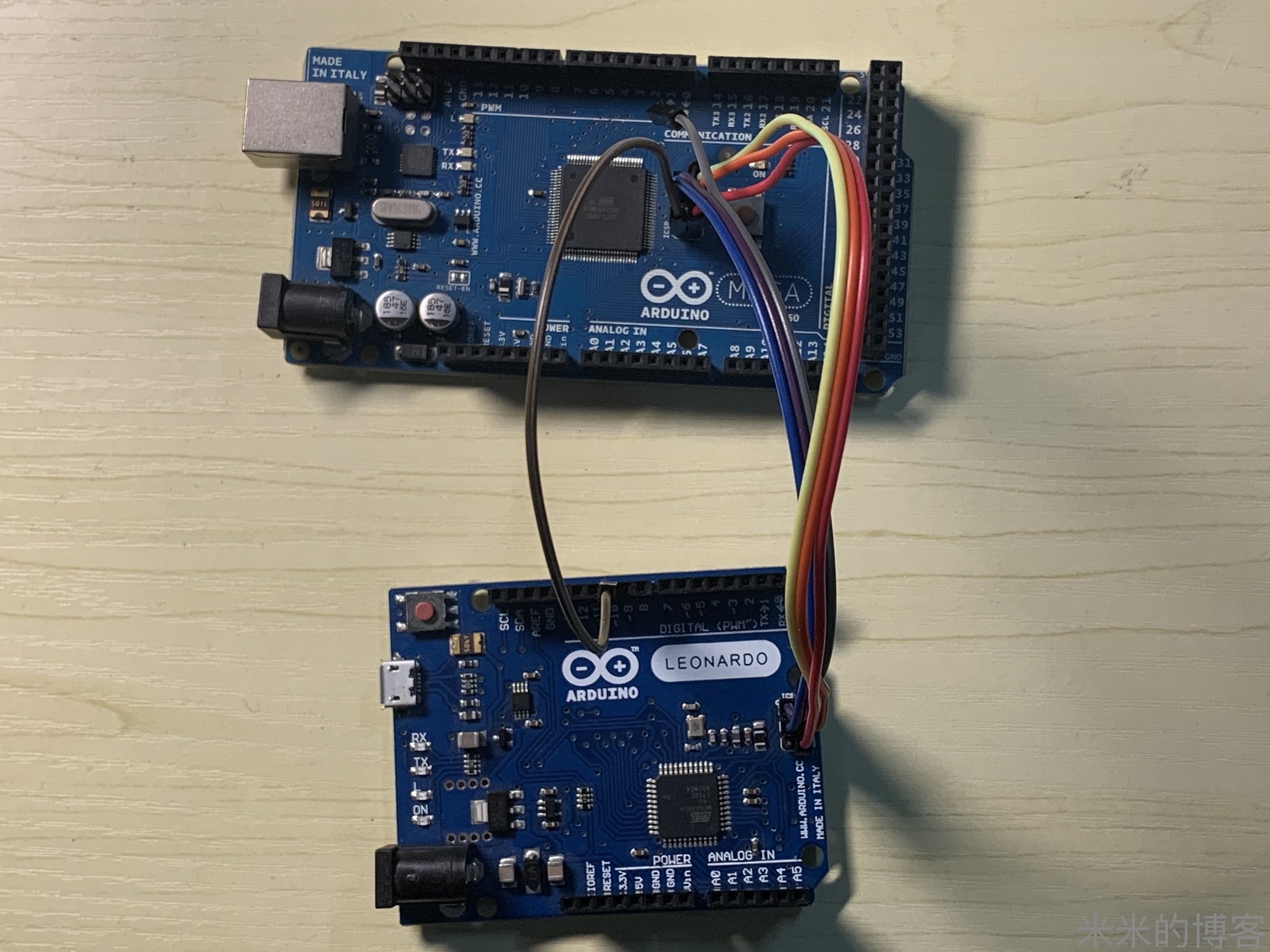 本文将介绍其中的一种方法:使用另一块 Arduino 开发板,作为 ISP(即 in-system programmer),来进行烧录。为了避免歧义,我们将功能正常的版称为「ISP 板」,而需要烧录 Boot Loader 的版称为「空板」。在具体的例子中,将一块「Arduino Leonardo」作为「ISP 板」,一块「Arduino Mega 2560」作为「空板」。