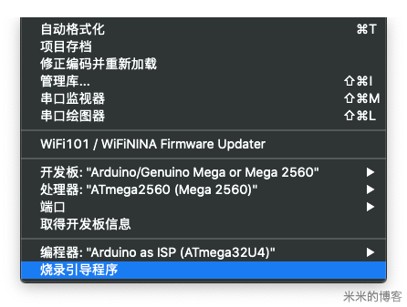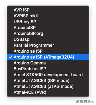 烧录 Boot Loader 的方式有很多种。在 Arduino IDE 的菜单中,选择「工具」 → 「编程器」,即可查看官方支持的方法: