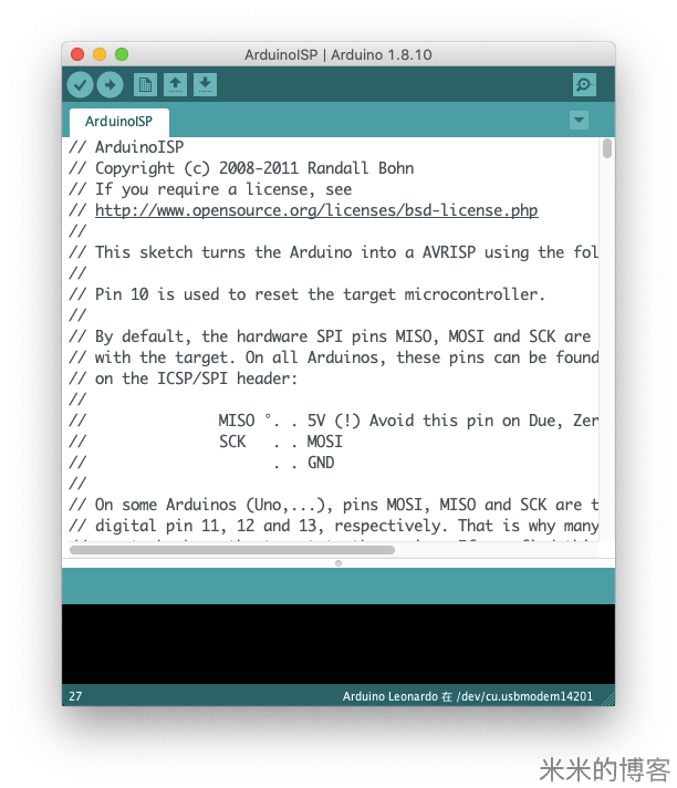 将「ISP 板」连接到电脑,并移除其它所有线缆。打开 Arduino IDE,在菜单中选择「文件」 → 「示例」 → 「11.ArduinoISP」 → 「ArduinoISP」。这是一个将 Arduino 变为 AVRISP 的程序,将其编译上传到「ISP 板」即可。