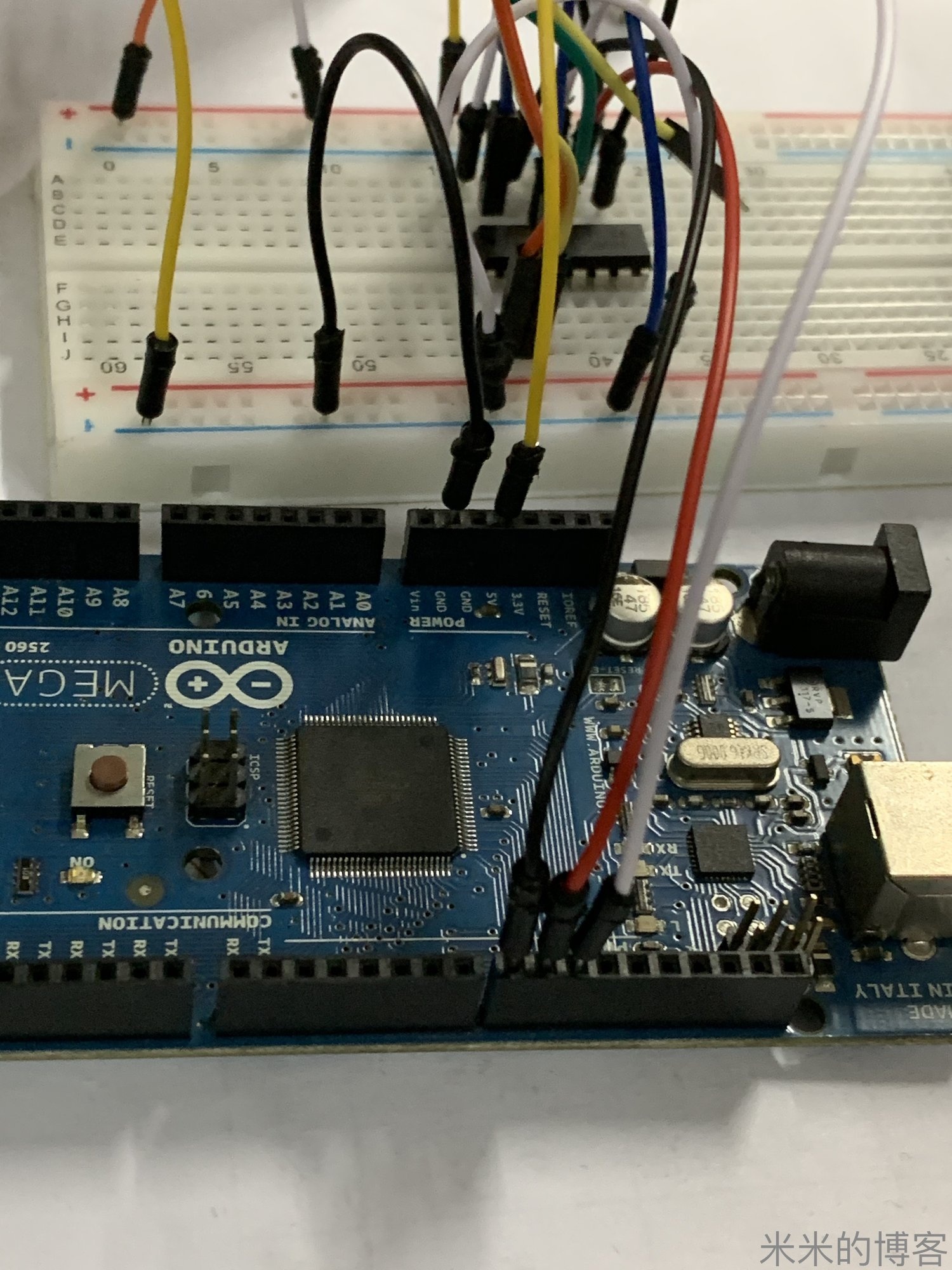 如下图所示,这三个引脚分别接到了 Arduino 的 10,9,8 引脚上。此外还需要将 OE 引脚接低电平,MR 引脚接高电平。