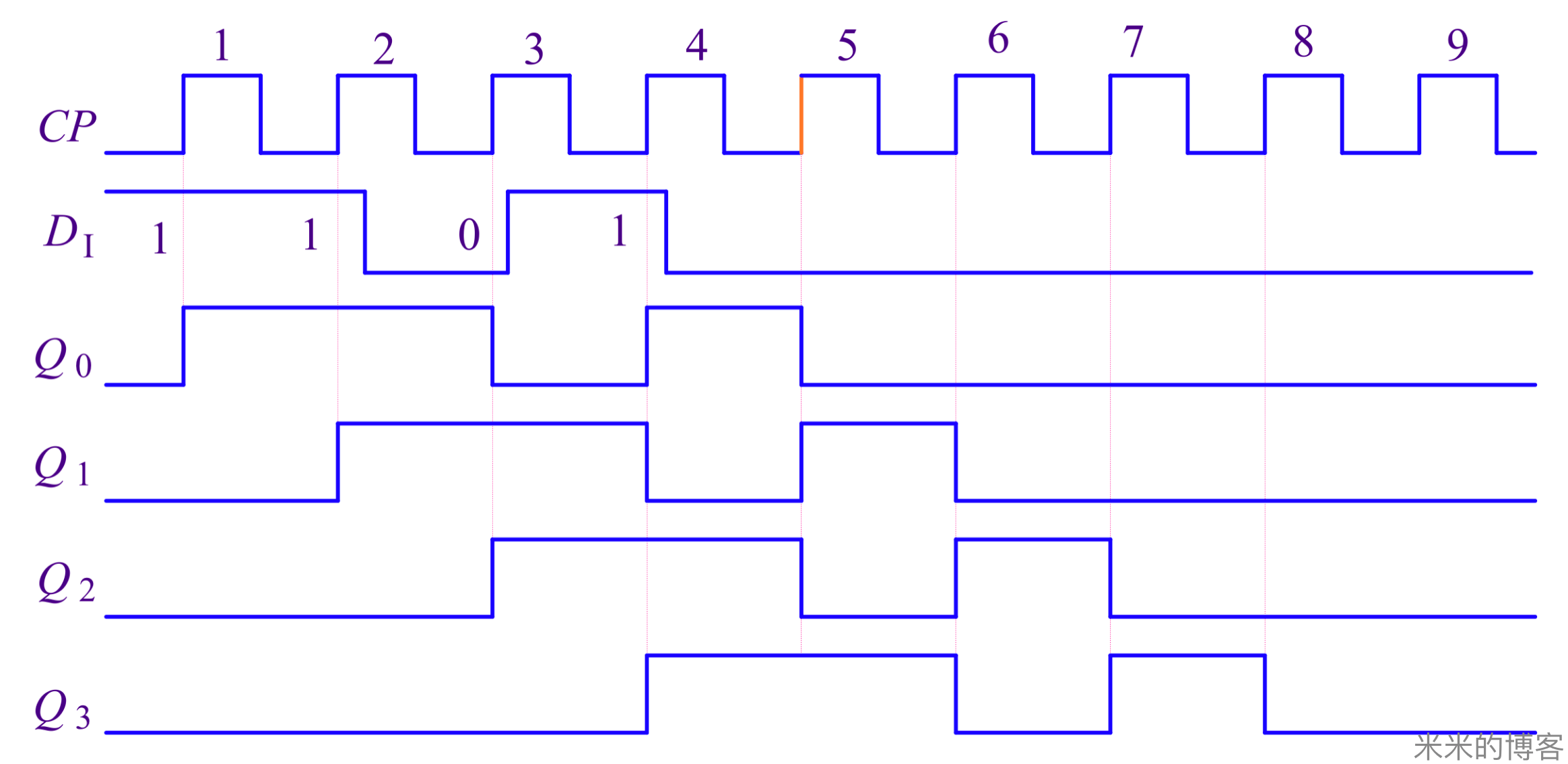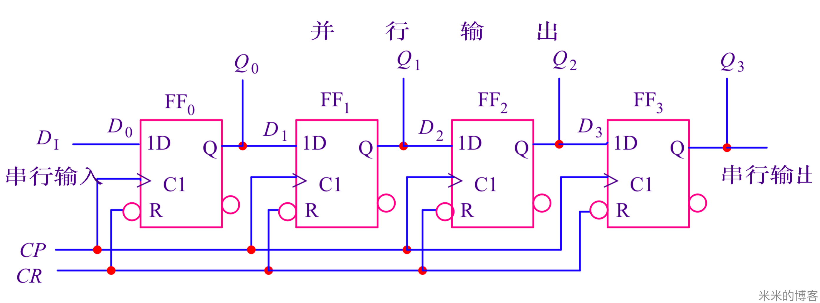 可以看到,如果同步地将串行数据和时钟信号输入,那么在四个时钟脉冲后,Q0,Q1,Q2,Q3 的输出就正好对应输入的串行数据。换言之,这实现了 4 位的串入并出移位寄存器。