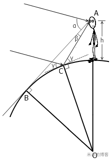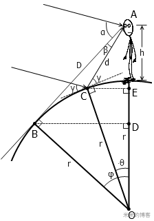 如果再已知人眼(或者说相机)离水面的垂直距离 h 为 1.8 米,那么根据这些数据我们就足以估算出地球的半径了。不妨把