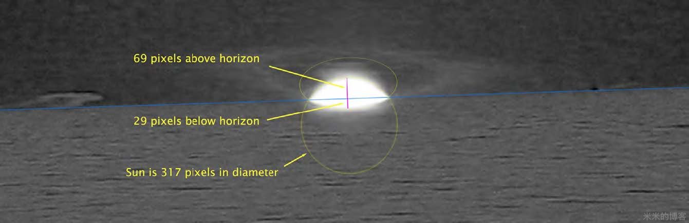 事情的起因就是上面这张很平常的日落照片,以及这样一个大家平时并没有太在意的问题:太阳露出水面的部分应该是一个标准的弓形,但为什么在日出日落时,我们所看到的太阳是一个橄榄球一样的形状?大家或许会很快想到,发光体的下半部分其实是日光反射在水面上造成的。随之产生的是另一个问题:为什么它的下半部分要比上半部分小一些呢?