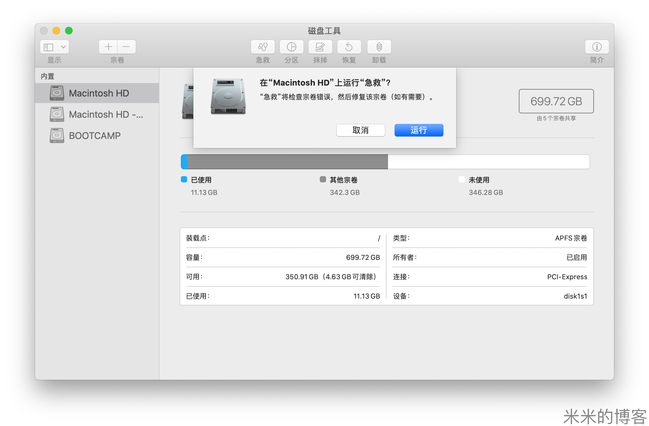 为了让「磁盘工具」确认最大能够划分的分区大小,需要在 Macintosh HD 上运行「急救」。在「磁盘工具」的工具栏中点击「急救」,然后选择「运行」即可。
