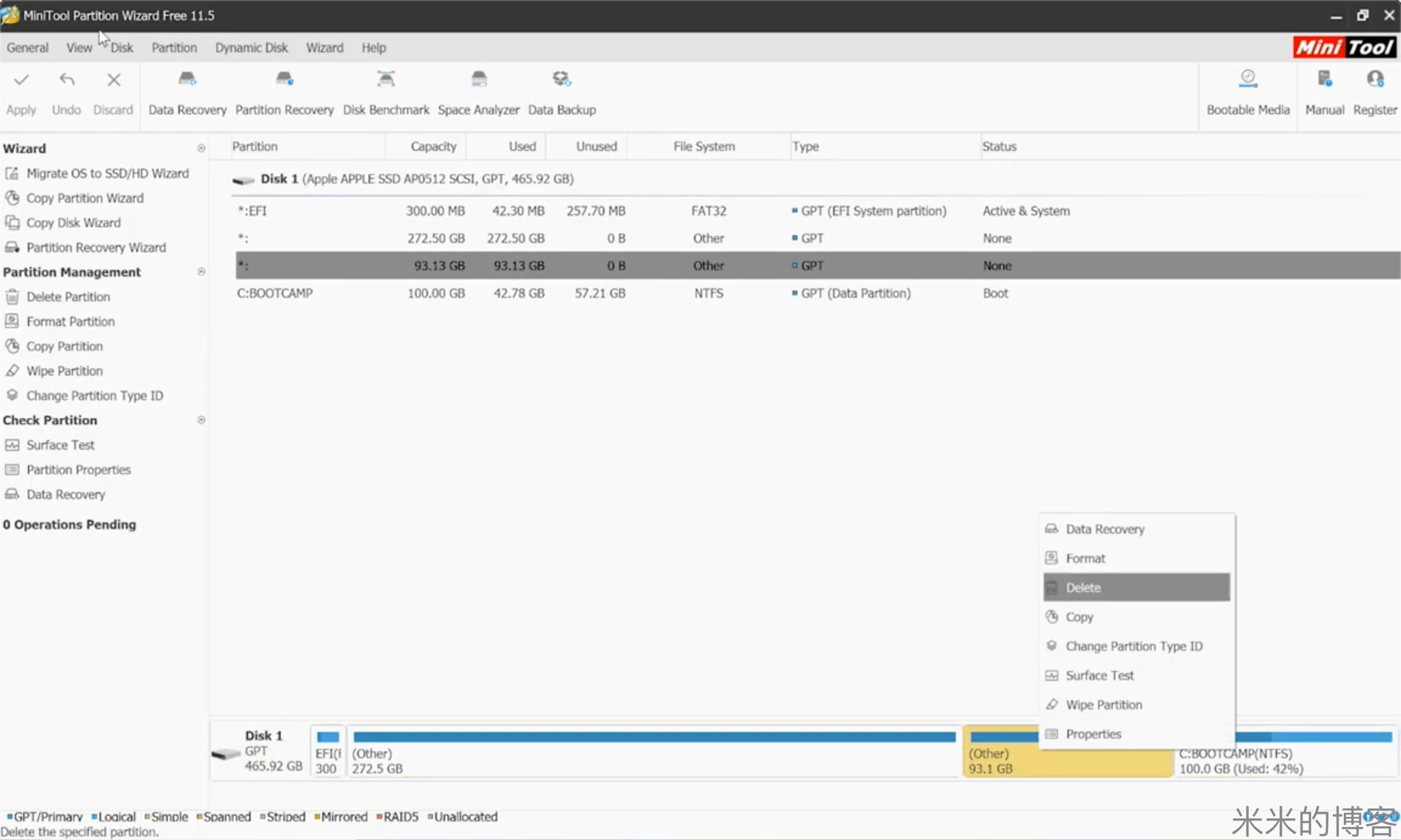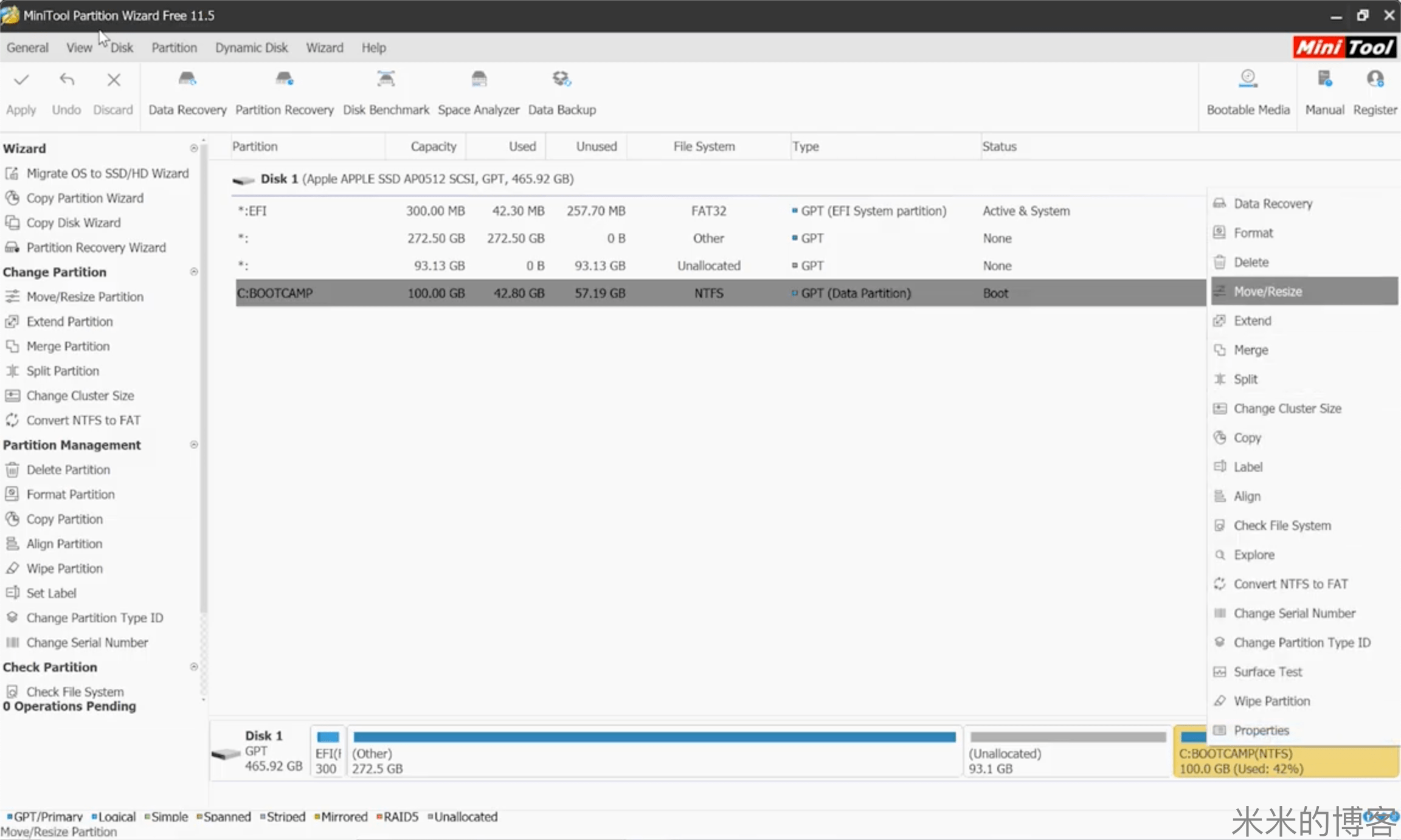 接下来,将 Bootcamp 分区与新的分区合并,即可实现对于 Bootcamp 分区大小的调整。本文以MiniTool Partition Wizard 为例。你也可以使用其它的分区软件进行操作,例如 DiskGenius。数据无价,请务必谨慎操作。