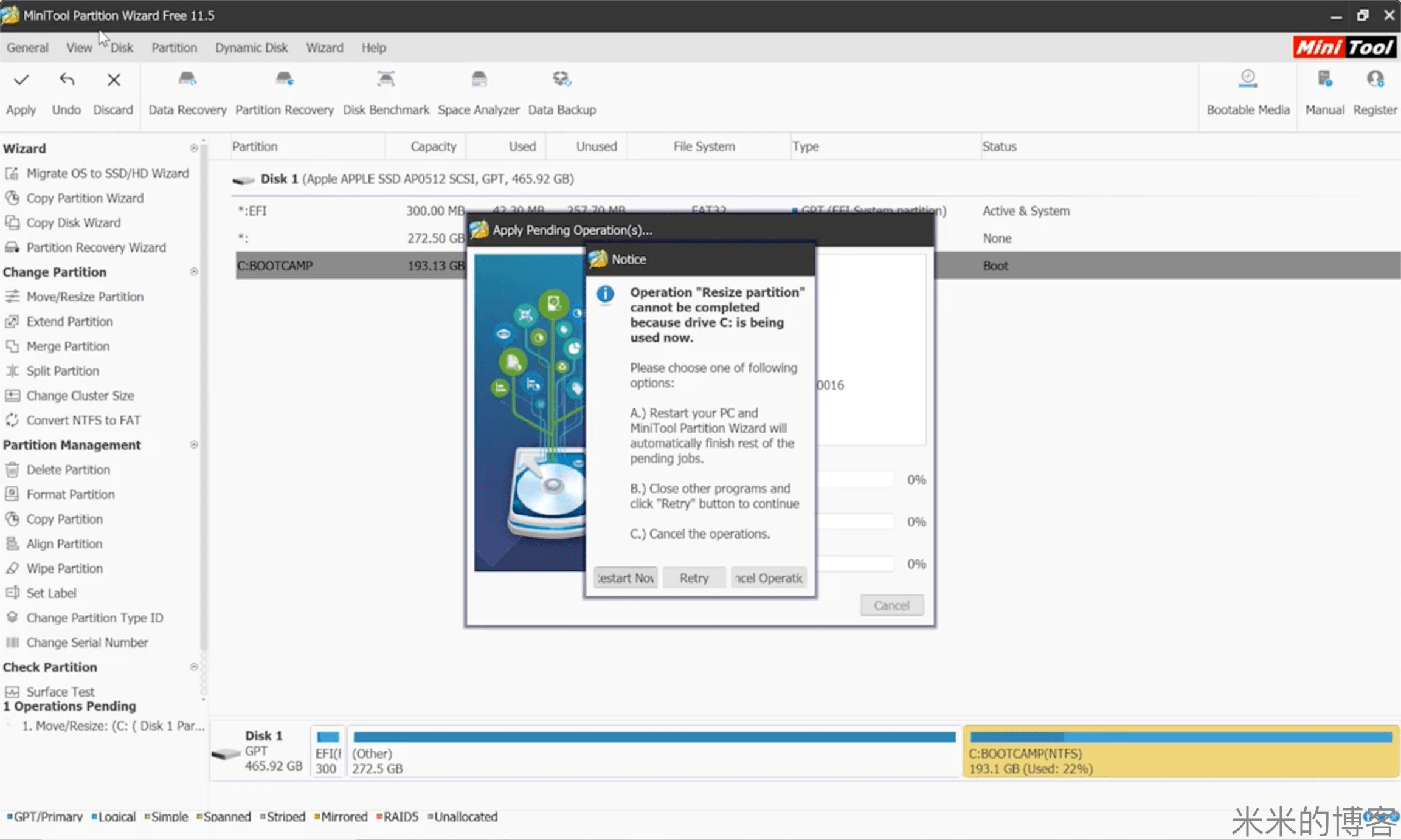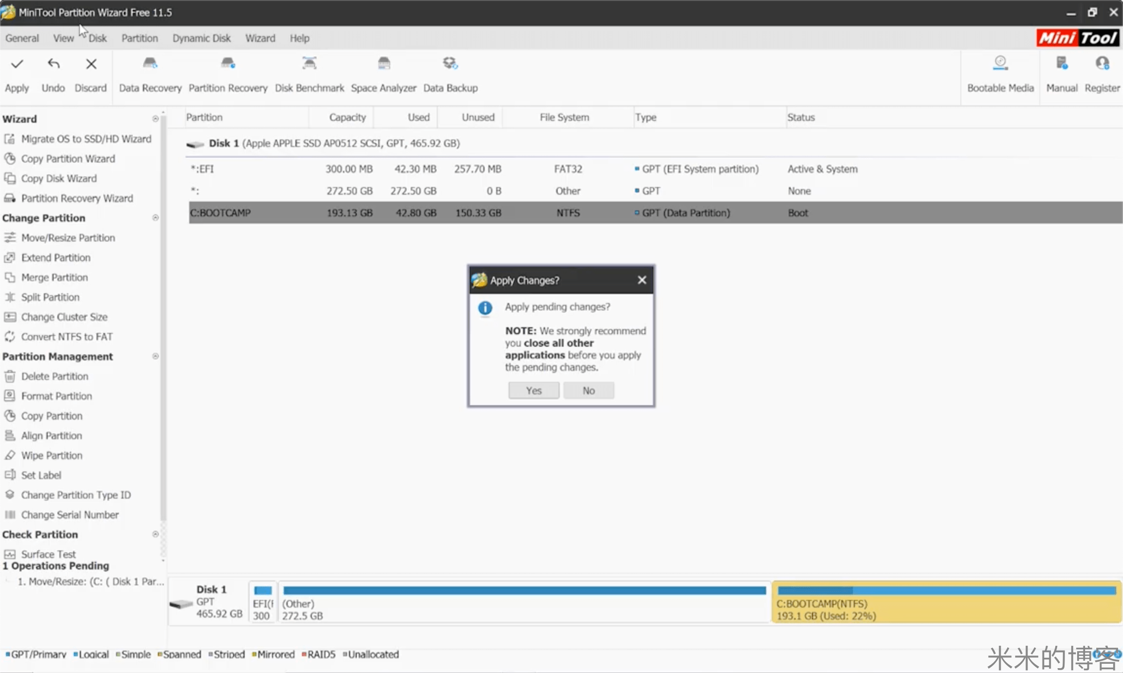 再次进入 Windows 系统时,MiniTool Partition Wizard 软件会自动完成接下来的步骤。至此,Bootcamp 分区的大小就调整成功了。