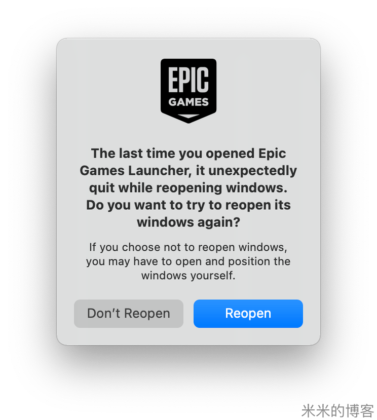 - 启动 Epic Games Launcher。如果弹出以下窗口,选择「Don't Reopen」。